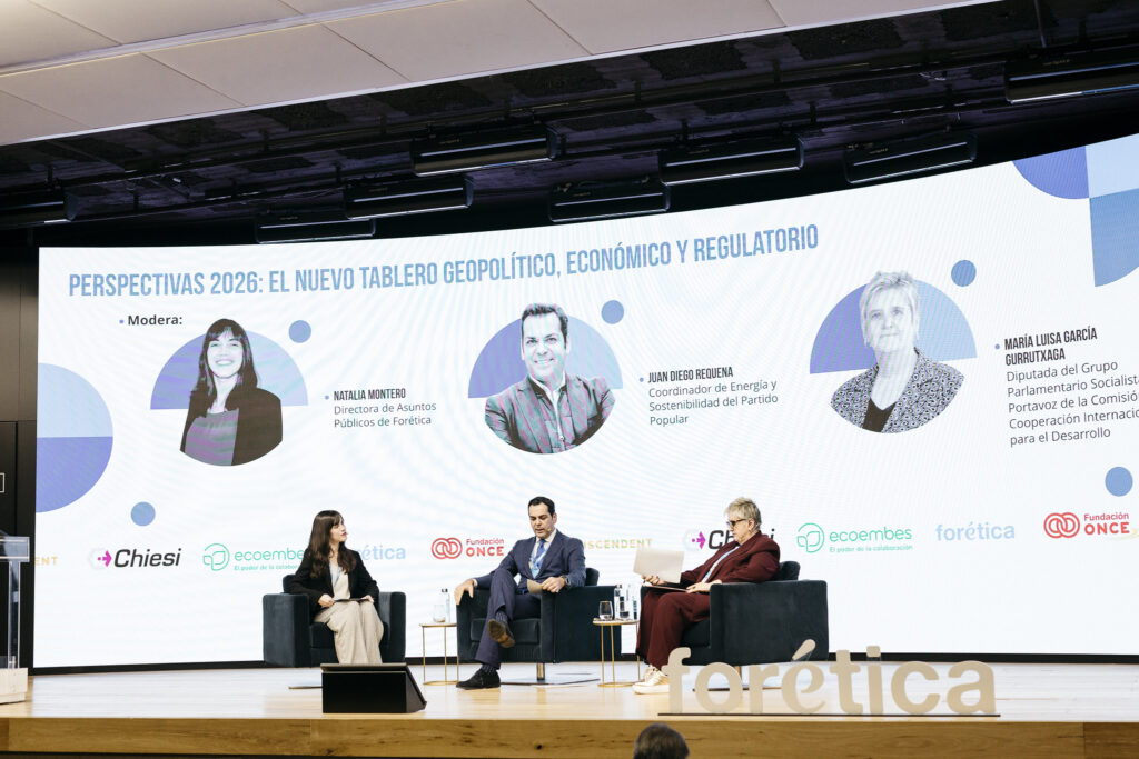 El evento de presentación del Informe de Tendencias y claves ESG 2026 contó también con una conversación enriquecedora entre Juan Diego Requena, Coordinador de Energía y Sostenibilidad del Partido Popular, y María Luisa García Gurrutxaga, diputada del Grupo Parlamentario Socialista y portavoz en la Comisión de Cooperación Internacional para el Desarrollo. La sesión, moderada por Natalia Montero, Directora de Asuntos Públicos de Forética, mostró un inusual y valioso punto de encuentro: ambas fuerzas políticas coinciden en la relevancia estratégica de la sostenibilidad para la competitividad empresarial y la cohesión social.